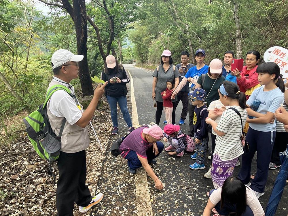 由國姓鄉福龜國小學生分享客語創作繪本及由社區志工擔任講客學堂關主,帶領遊程民眾一起加入生活客語闖關活動,並參與客語互動。