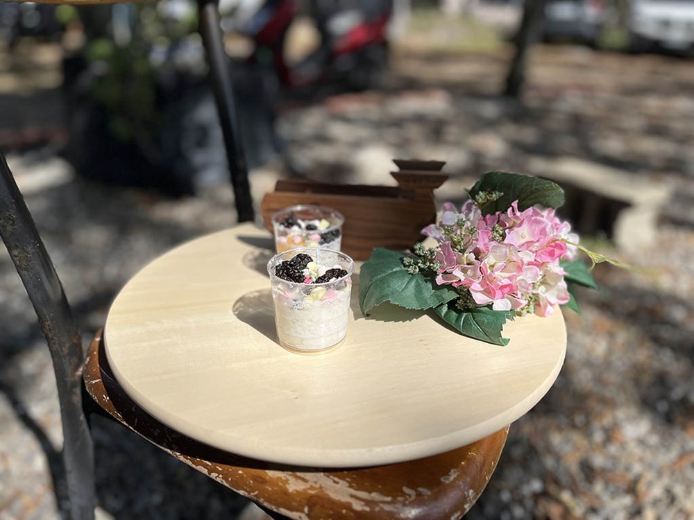 服務台位置,提供方向指引及活動內容諮詢,遠眺山林美景並在這先來手作第1個客庄麻糬-牛搵水。