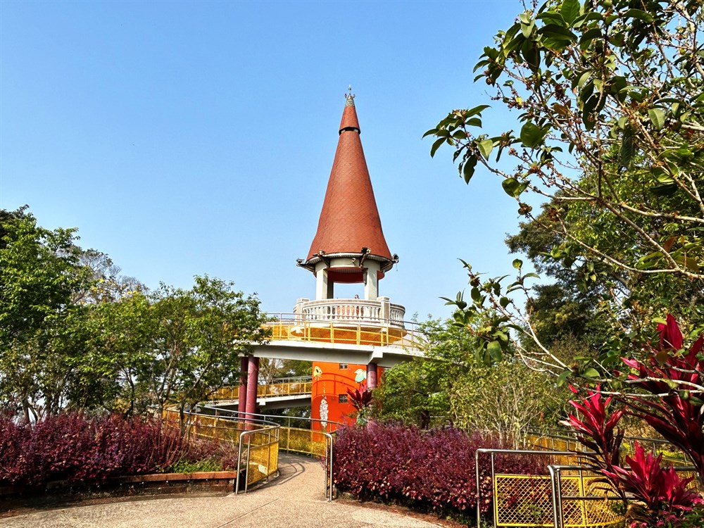 猴探井景觀塔 : 園區內有座尖頂觀景塔,站上高處可盡覽彰化平原、夜間更可欣賞高鐵往返燈光與社頭鄉夜景。