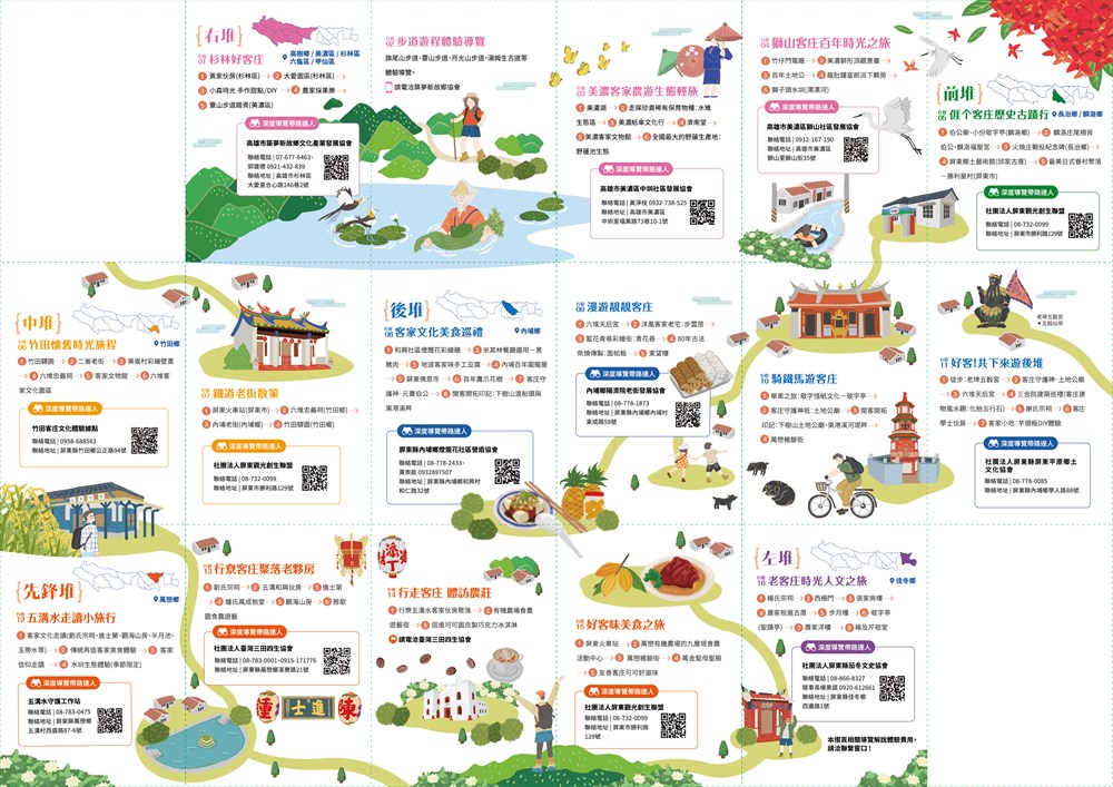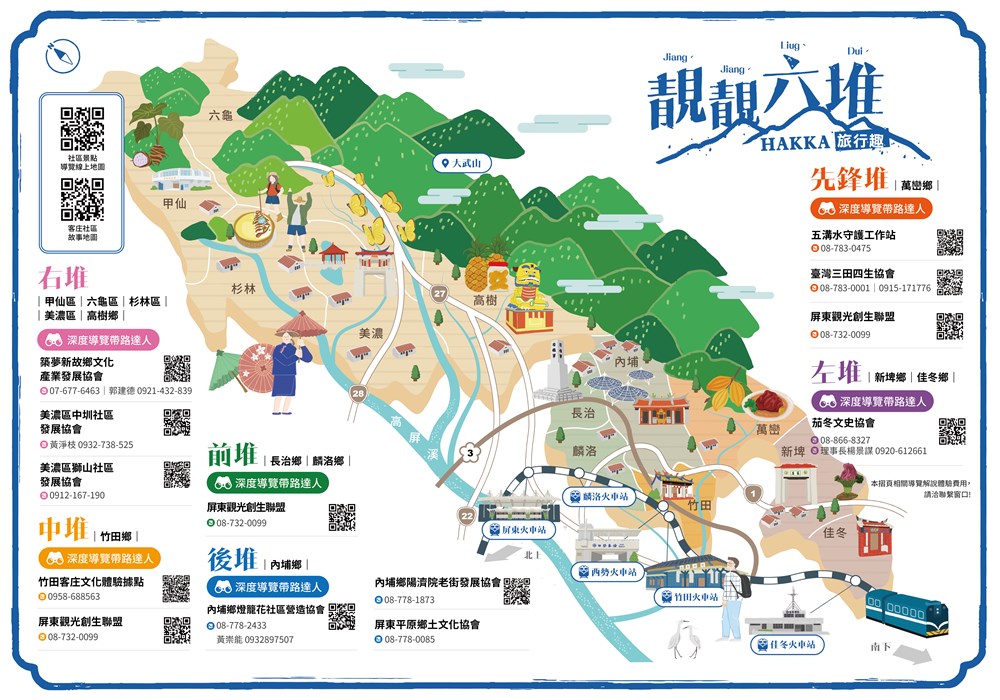 六堆是高屏地區客家族群聚居地區的統稱,分為右堆、中堆、前堆、後堆、先鋒堆、左堆。現在到六堆地區旅遊可以預約深度導覽,包含步道遊程、生態輕旅、歷史古蹟行、老街散策、美食巡禮、鐵馬遊客庄...等等的遊程,讓帶路達人帶著你體驗人文及美食,深度感受客庄在地小旅行。