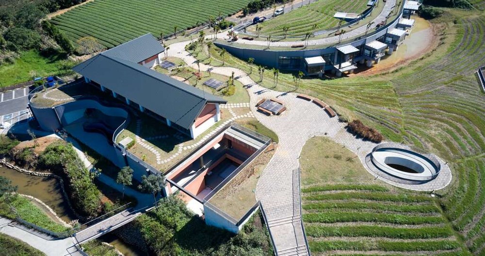 座落於龍潭高原交流道旁的「臺灣客家茶文化館」,順應山坡地形建造,是一座融合地景的生態建築,更榮獲美國繆思設計大獎。館舍以簡樸清寧的設計風格,呼應「正靜清圓」的茶道精神,成為浪漫臺三線上的必遊亮點。