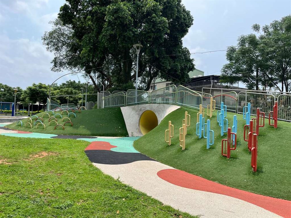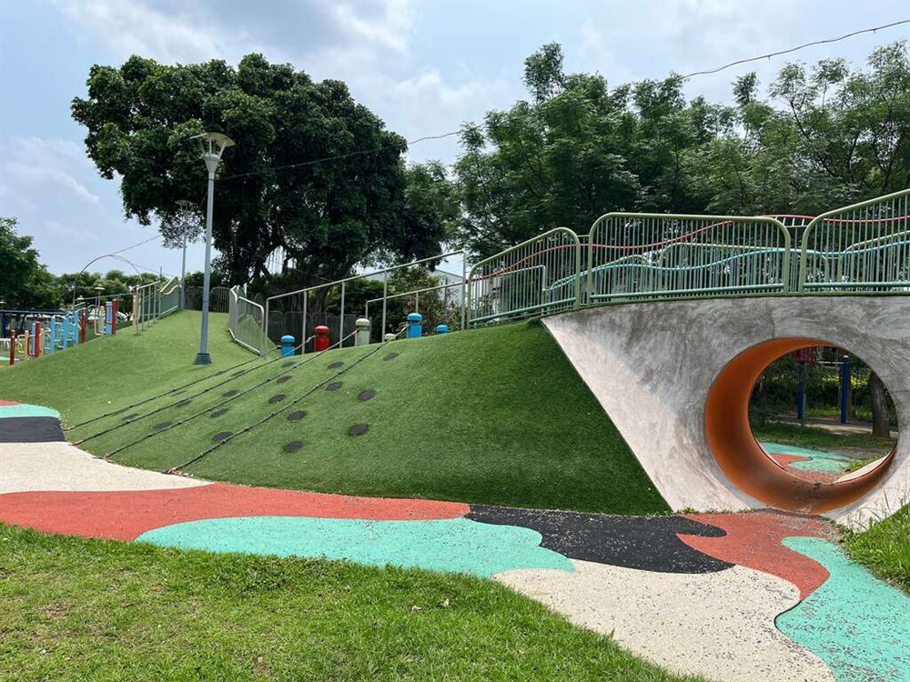 公園整體色彩計畫以活潑的迷彩為基本色調,融合在地特色,讓原本嚴肅的軍事場景,瞬間化身為滿足全齡、活潑舒適安全的遊戲場,提供並引導不同年齡層共同使用,打造親子共遊、全民樂活的碉堡特色公園。