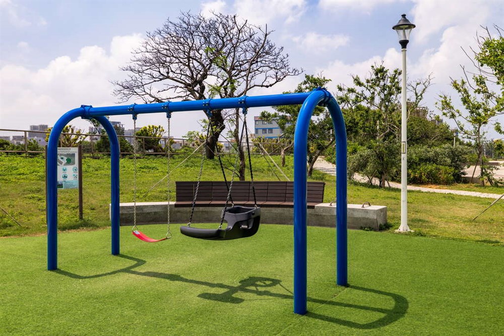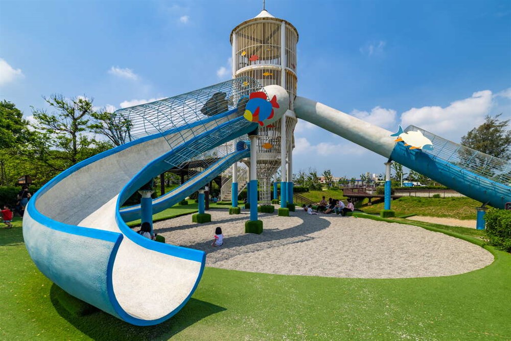 公園最吸睛的設施,非三層樓高的飼料桶溜滑梯莫屬!這座滑梯以桃園埤塘常見的飼料桶作為設計概念,不僅具有地方特色,還賦予設施獨特的意義,巧妙結合當地文化,為孩子和大人們打造出一個既有趣又充滿在地情感的遊玩體驗。這裡有三種滑道,分別為不同的高度和刺激程度,完全滿足想要挑戰自我的孩子的衝勁。從滑梯高處滑下的那瞬間,保證是驚喜與成就感雙重爆發!