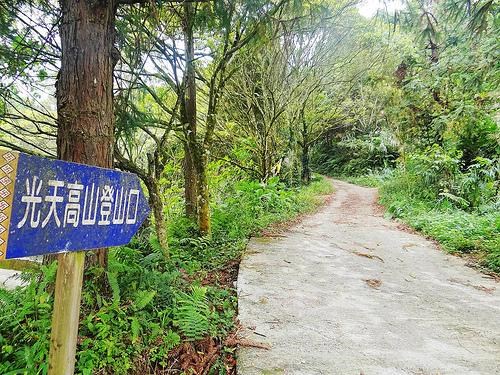 佈道沿線林木濃密,杉木高聳好似達天際,日光撒落而下,讓人不由得駐足欣賞。繼續前行經過巨石,爬坡上行,林木下各式蕨類和花草正茂密。沒多久,到了地勢較平坦的小臺地,可在此略作休息,平山界水樁就在左方。再往前行,抵達鞍部外緣,可見林木茂盛、小徑,再尋著露出地面樹根自然形成的階梯行去,步上稜線後,向西而行直到山頂。 於山頂東北方可以找到四等三角點,高大櫟樹聳立,山影四周的林木高大,雖遮阻了部分展望視線,但東北面斷崖可眺望鵝公髻山,西面尚能看到台灣海峽,且能於山頂享受輕風吹拂,伸展四肢,呼吸吐納山林清新空氣。 1.起迄:東河村向天湖部落~光天高山三角點(南江村) 2.登山口:向天湖部落18號民宅左上方 3.步道長度:3公里,步行時間:單程約1小時50分鐘 4.步道路徑:光天高山登山口→稜線旁高台→巨石→「平山界地標臺地」→光天高山