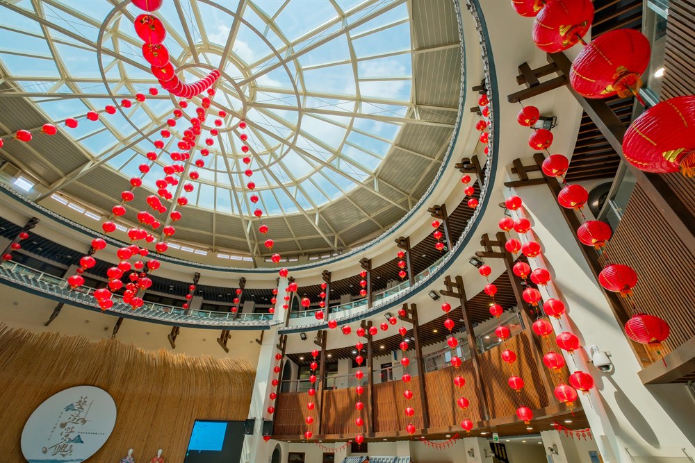 客家圓樓的一樓主體為圓型展演劇場,台上有斗大的客家戲臺字樣、花布燈籠高掛兩旁、觀眾座位則是古樸的板凳;二樓主要為展示空間,規劃有「客家戲曲館」、「客家音樂館」及「城市文化交流 展」,屬靜態展覽;三樓設置DIY研習教室,另外還有多媒體互動專區,運用虛擬合成技術,讓自己與苗栗多處著名景點及建築物合影留念;地下一樓則為多媒體放映室,播放相關影片。 為提供更多元服務,客家圓樓也有附屬餐廳、販賣部的設置,主打客家風味與在地特色創意商品,讓民眾來此還可以品嚐體驗苗栗最真實的本土風情! 在「客家圓樓」周邊,還設置了夜間燈光照明設施,太陽下山後的客家圓樓燈光點綴夜色,更有景 觀水塘映月相襯,呈現不同於日間的浪漫風情。此外,每周五、六、晚上7點、8點、9點整各1 場活動,在圓樓旁的北勢溪親水廊道都有水舞表演,與客家圓樓遙望輝映,讓高鐵車站特定區內的夜晚更加璀璨迷人!