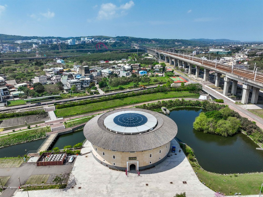 客家圓樓鄰近苗栗高鐵站,是整條親水廊道中最精華之區域,堪稱為「北勢溪之心」,其建築形制仿照大陸原鄉土樓形制建造,客家味十足,另設有環池步道,觀景弧形平台、入口迎賓廣場及親水棧道等豐富的遊憩設施。客家圓樓佔地1,385 平方公尺、總樓板面積3,476 平方公尺,為地下一層、地上三層的結構,空中俯瞰呈現一個環形建築結構。客家圓樓的規劃方向是以本土客家文化為主軸,尤其苗栗是客家音樂戲曲發展重鎮,因此定位為客家戲曲與音樂之主題場館,安排相關展演節目活動,並邀請表演團體進駐,供民眾欣賞研習。