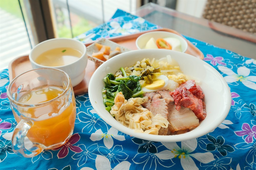 菜單上的主打菜色,是農村午餐的碗公飯,碗公內盛著熱騰騰的香Q米飯,搭配道地客家鹹豬肉,以及超下飯的醃漬小菜,碗公以色彩鮮亮的客家花布包起,別緻又充滿客家風情。米珍珠奶茶、米布丁、米蛋糕等等,更是極富池上特色的飲品甜點,喜歡嘗鮮的遊客別錯過。吃飽了還意猶未盡,一樓有各色農特產品,精選品項讓遊客一次打包帶回家。