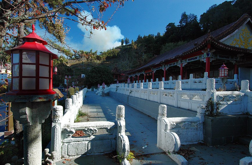 正對著梨山觀景臺的梨山遊客中心原為梨山賓館的「清心閣」,並作為飲料、紀念品的販賣部,同為紅瓦中式建築,在藍天白雲下相互輝映。如今改建為遊客中心,門口一座展開雙臂奔跑的泰雅族女孩雕像歡迎著旅人們光臨。