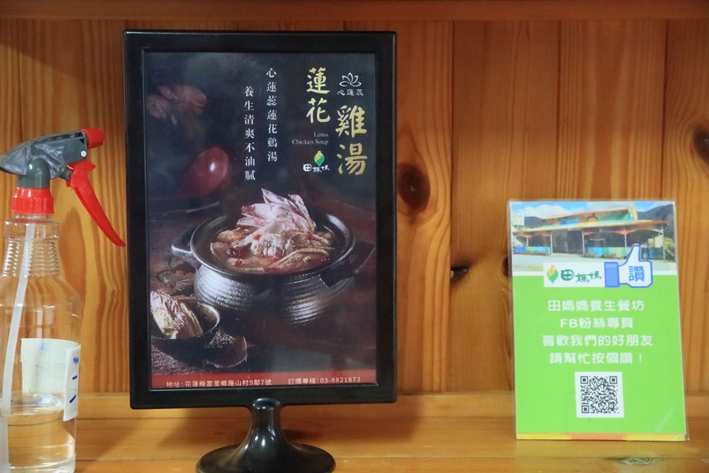 田媽媽養生餐坊位於花蓮富里鄉的羅山村入口處。羅山村是國內第一個有機農業村,田媽媽採用自家農園栽種的有機蔬果與稻米,以及農會的火山豆腐與羅山村特有的放山雞等。