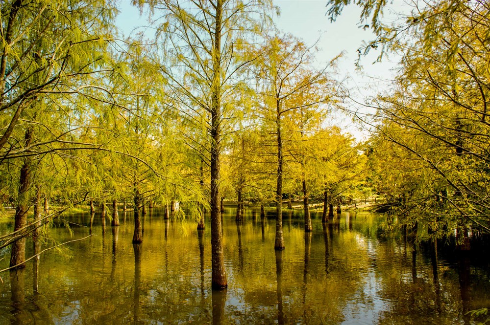 經過網路瘋傳爆紅後的鈺展苗圃落羽松林,絕美程度不輸給雲山水,一到賞落羽松的季節時,整片金黃的落羽松林或是冬季落葉前的橘紅的景致,總是吸引大批人潮前來朝聖,欣賞猶如北國夢幻般的風景。每逢秋冬之際,鈺展苗圃的落羽松從翠綠漸漸轉黃,一大片金黃燦爛樹林倒映在波光粼粼的水中,與水裡優游的錦鯉相互輝映,為這番酷似北國風情的美景,增添幾分活潑的氣息。坐在水畔旁喝杯下午茶,欣賞這番如仙境般的落羽松林,或是餵食錦鯉與拿牧草餵牛,都能讓人度過愜意的午後,臨走前記得把垃圾隨手帶走,讓美景繼續留給其他人欣賞。