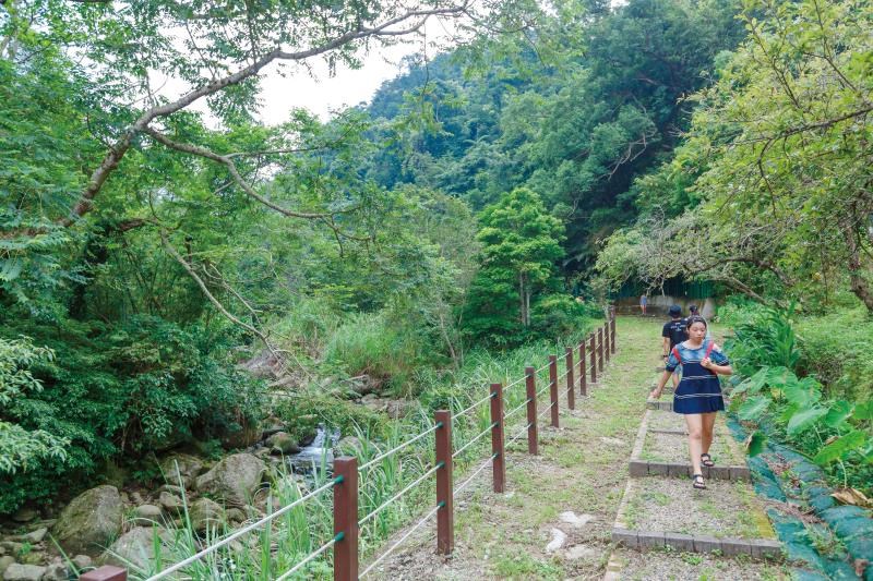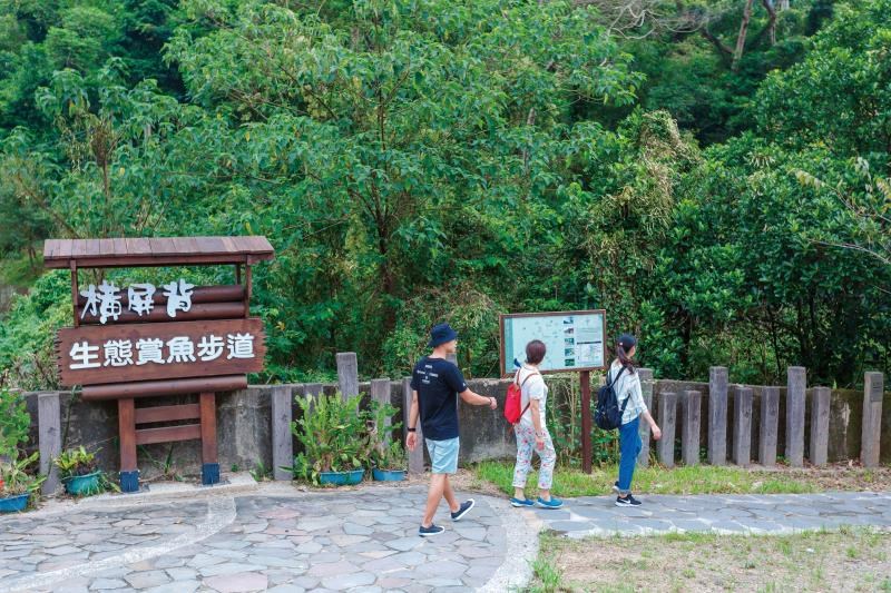 橫屏背生態賞魚步道地處潮濕的溪谷水岸旁,樹木蓊鬱茂盛,蘊育著豐富的生態資源,潺潺流水包覆在一片綠意盎然間,可以親水近距離觀賞溪中的魚蝦悠遊。步道上每隔 200 公尺左右就設有長椅,讓遊客可以歇腳休息,一路上都有鋪設有碎石子的枕木階梯步道,坡度起伏也不甚大,大約半小時就可以走完全程,是休閒踏青接近大自然的好去處,每年春夏交替時節還有螢火蟲與桐花美景,適合全家一同賞遊。