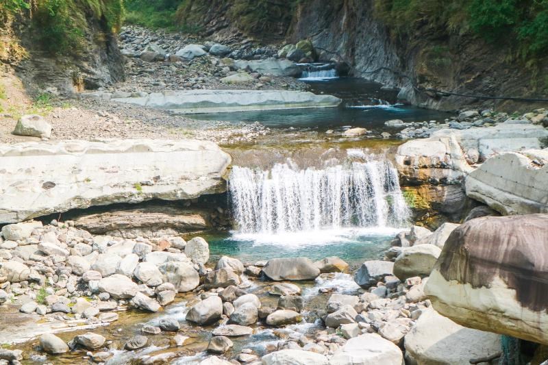 一路沿著汶水溪畔道路前進,約10來分鐘的車程來到苗 62 線終點「泰安溫泉風景特定區」,便可下車步行碎石步道,約10分鐘即可抵達,橋邊有一塊大石頭寫著「水雲吊橋」四個大字。 紅色的橋身橫跨在綠樹青山間格外顯眼,走上木棧階梯後來到橋頭,許多民眾都會在這模仿男女主角的劇照,而從橋上可以欣賞汶水溪谷的景致。