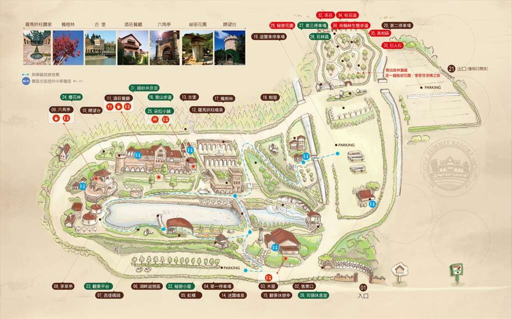 步入莊園,映入眼簾的是粗曠的奇岩、原木建築與羅馬式拱門,古堡、酒莊、花園錯落有致地分布在湖畔與山坡間,讓人瞬間有時空錯置之感,忘卻塵世喧囂。這裡依山造勢,保留了豐富的自然原貌,您可以在層巒疊翠間享受芬多精的洗禮,或在湖畔感受微風輕拂的愜意。無論是陽光灑落的午後,還是雲霧繚繞的清晨,莊園的每一步都充滿驚艷。這不僅是一個觀光景點,更是一個讓心靈獲得撫慰、不用出國就能體驗歐洲度假風情的絕美仙境。