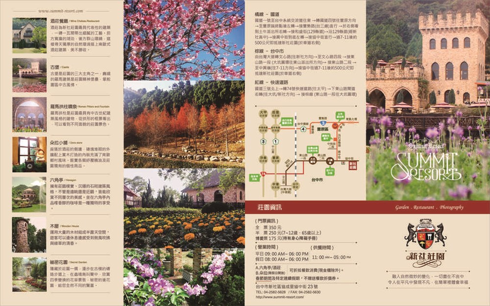 素有「中臺灣陽明山」美譽的臺中新社區,四季氣候宜人,年均溫23度,是最適合居住與旅遊的避暑勝地。在這片綠意盎然的山林中,「新社莊園」以其磅礴的氣勢,打造出一座彷彿置身中古世紀歐洲的夢幻國度。莊園的誕生源於九二一大地震後的重生信念,經營團隊不惜費時費工,將對鄉土的熱愛轉化為國際級的景觀,期許打造出媲美加拿大「布查特花園」的福爾摩莎新地標。