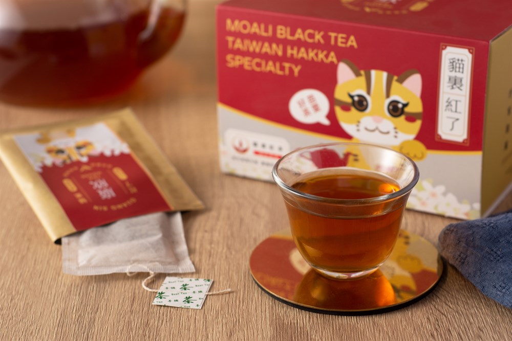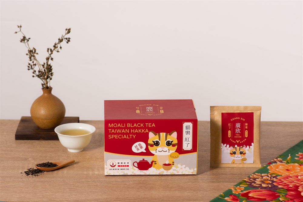 廣欣茶行設計的貓裏紅茶「貓裏紅了」造型十分可愛、喜氣,一心二葉茶菁為原料,融合東方美人萎凋及紅茶發酵工法製作而成的「貓裏紅茶」,再次向世界展現苗栗客庄貓裏紅茶的頂級茶工藝,非常適合當伴手禮送給親友。