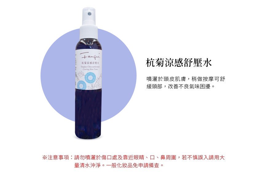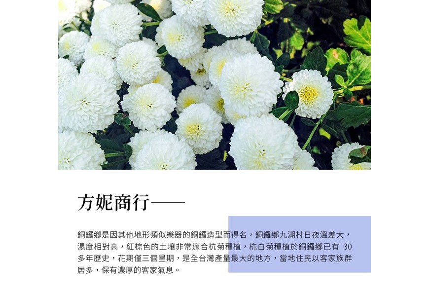方妮商行在銅鑼鄉農會輔導下,利用無法銷售的杭菊末,研發成為清潔用品及保養品,不但增加農民收入也創造杭菊的多重價值。杭白菊種植於客家銅鑼鄉有30多年歷史,花期僅三星期;杭菊內含多種維生素和微量元素,透過與產、官、學合作方式開發出一系列杭菊商品。杭菊涼感舒壓水不添加化學矽靈、香精、色素、螢光劑、環境荷爾蒙、增稠劑,不用擔心化學殘留,頭皮專用。