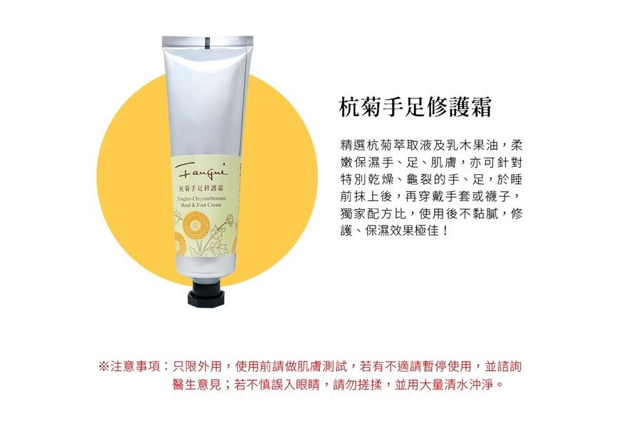 精選杭菊萃取液及乳木果油,柔嫩保濕手、足、肌膚,亦可針對特別乾燥、龜裂的手、足,於睡前抹上後,再穿戴手套或襪子,獨家配方比,使用後不黏膩,修護、保濕效果極佳!