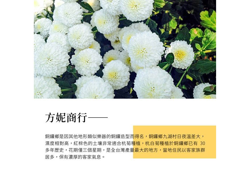 方妮商行在銅鑼鄉農會輔導下,利用無法銷售的杭菊末,研發成為清潔用品及保養品,不但增加農民收入也創造杭菊的多重價值。杭白菊種植於客家銅鑼鄉有30多年歷史,花期僅三星期;杭菊內含多種維生素和微量元素,透過與產、官、學合作方式開發出一系列杭菊商品。杭菊手足修護霜不添加化學矽靈、香精、色素、螢光劑、環境荷爾蒙、增稠劑,不用擔心化學殘留。