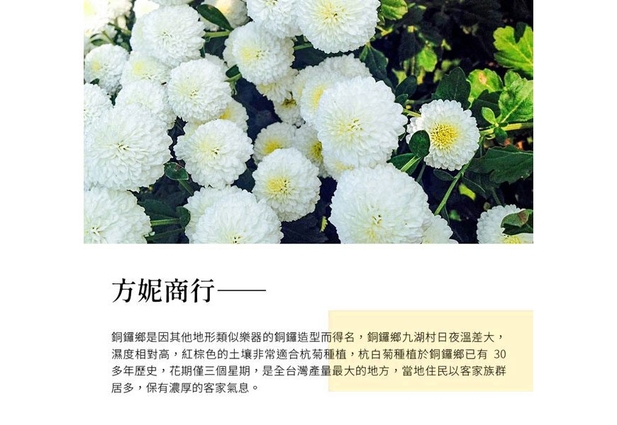 方妮商行在銅鑼鄉農會輔導下,利用無法銷售的杭菊末,研發成為清潔用品及保養品,不但增加農民收入也創造杭菊的多重價值。杭白菊種植於客家銅鑼鄉有30多年歷史,花期僅三星期;杭菊內含多種維生素和微量元素,透過與產、官、學合作方式開發出一系列杭菊商品,無添加矽靈、螢光劑等化學成分,對於敏弱肌膚亦不造成負擔或刺激;杭菊舒緩霜添加香茅,氣味清香,採用乳霜狀質地,更好吸收且不黏膩。