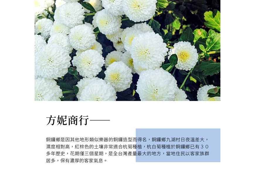 銅鑼鄉是因其他地形類似樂器的銅鑼造型而得名,銅鑼鄉九湖村日夜溫差大,濕度相對高,紅棕色的土壤非常適合杭菊種植,杭白菊種植於銅鑼鄉已有30多年歷史,花期僅三個星期,是全台灣產量最大的地方,當地住民以客家族群居多,保有濃厚的客家氣息。