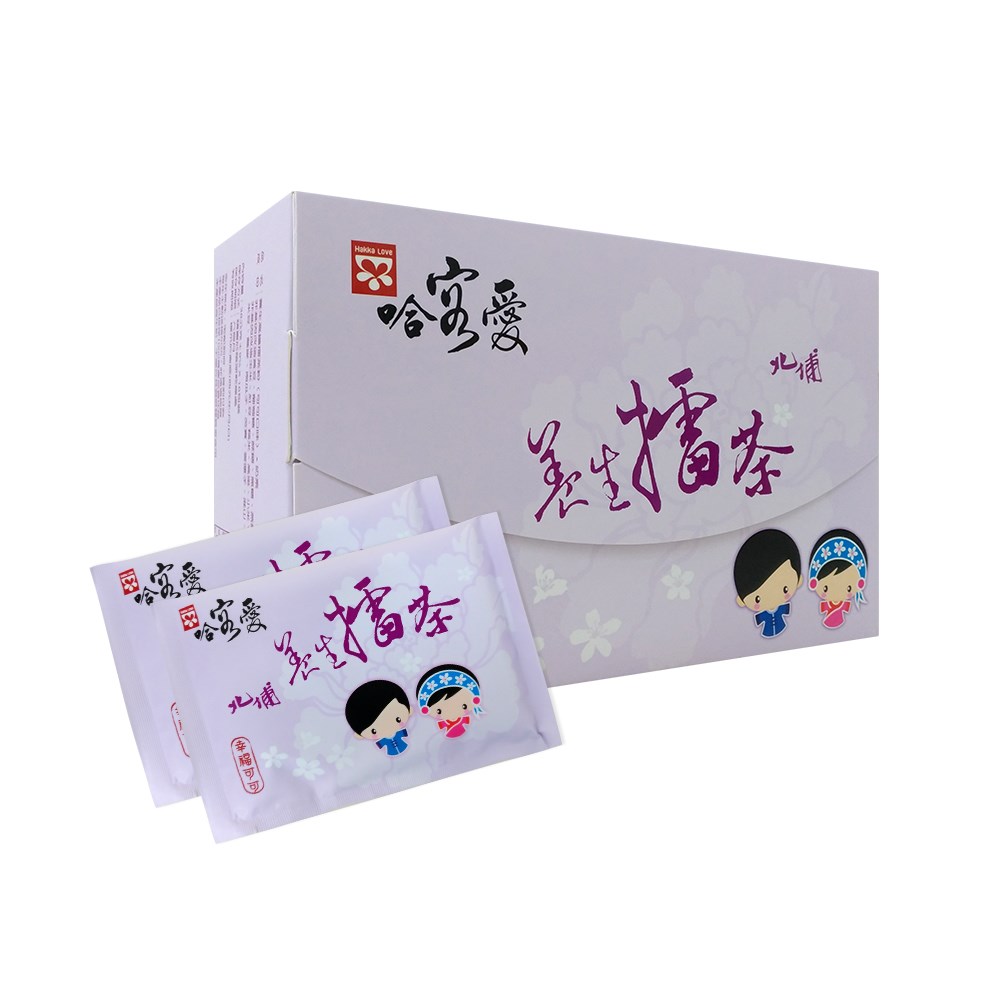 「哈客愛」乃是客語「大家愛」的諧音,以堅持製造「健康養身的客家美食」精神,來傳達與發揚我們的哈客之愛。為突破傳統擂茶店給人的刻板印象,哈克愛研發出許多擂茶創意喝法,讓喝擂茶也能像品嘗英式下午茶般那種悠閒雅緻的品味氛圍。本產品嚴選新竹縣峨眉鄉之東方美人茶比賽茶園所產的春茶,由本地有名之製茶師製作成綠茶,運用高溫蒸菁、快速殺菌及冷凍隔水研磨之最新技術,加上炒熟之豆類,清蒸糊化之穀類及中藥養生食材等,共24種食材。因此沖泡擂茶時,能保有天然濃郁的五穀香及茶香,且溫和不燥熱,是高纖、低糖、低熱量的養生飲品。