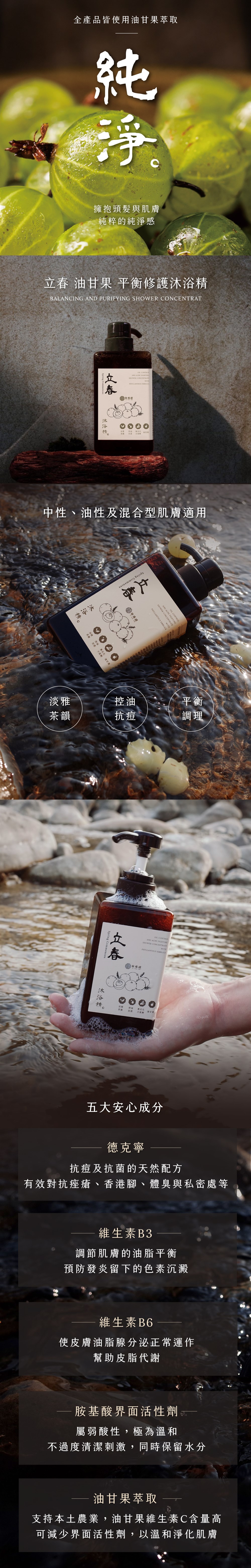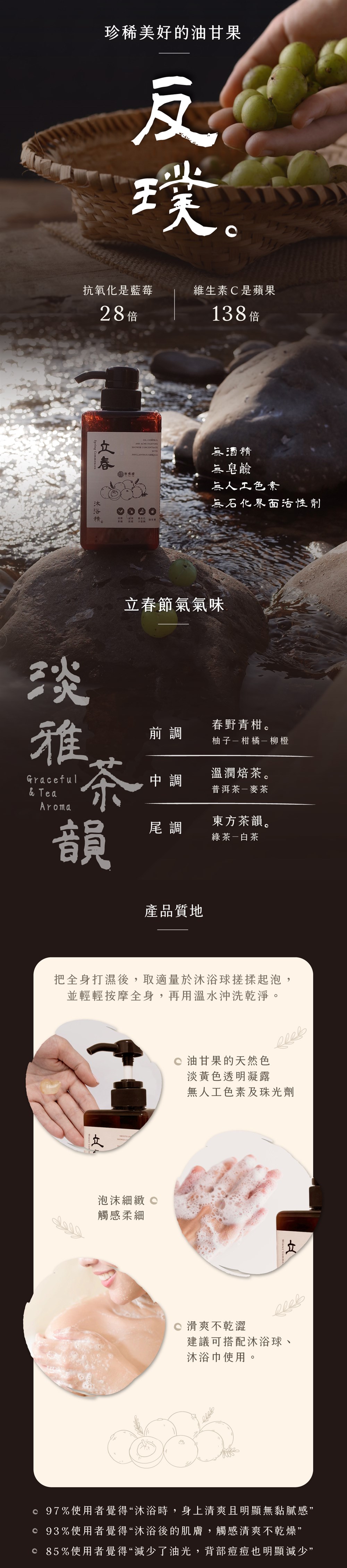 - 萃取天然油甘果植物|本身的高含量維生素C和維生素E,具抗氧化性,可淨化肌膚,同時擁有植物多酚及黃酮類成分,能清潔抗污,有效洗淨。