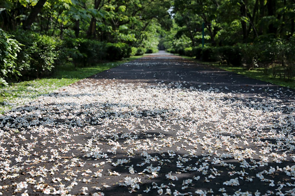 隱身於山林間的南華桐花林道,是一片春日限定的純白仙境。每到3、4月間,綿延3、400公尺的林道上,200多棵油桐樹綻放雪白花朵,片片花瓣隨風輕舞,鋪滿步道,如詩如畫,宛如大地鋪上的一襲素雅花毯。
