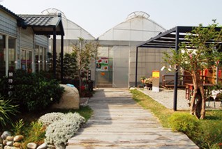 愛情果園所採用的溫室形態是在許多溫室中特地挑選出來的,因為考量台灣季節的變化,在夏季一般溫室內會形成溫度的聚集現象,而高溫對於室內栽培的作物,會造成結果困難的情況,尤其是番茄這種作物。所以,當初在做溫室形態選擇的時候,即需尋求可以降溫、散熱方便的設計,當時便選了屋頂捲揚式的結構,它的屋頂設計是整個塑膠布可以捲起至中央的太子樓下面,所以當屋頂捲起的時候,上面只剩一層細網,熱能就不會累積在室內,因此內外的溫差大約在兩度上下,再加上有裝設排風扇,萬一裡面熱導流循環不佳時,排風扇作用後,溫度會很快受到控制。