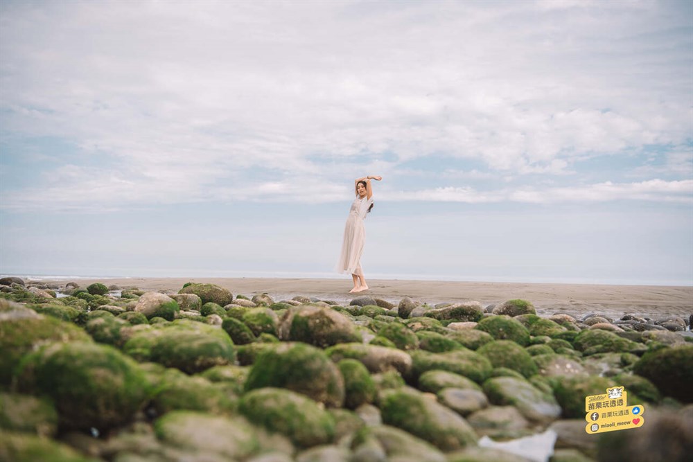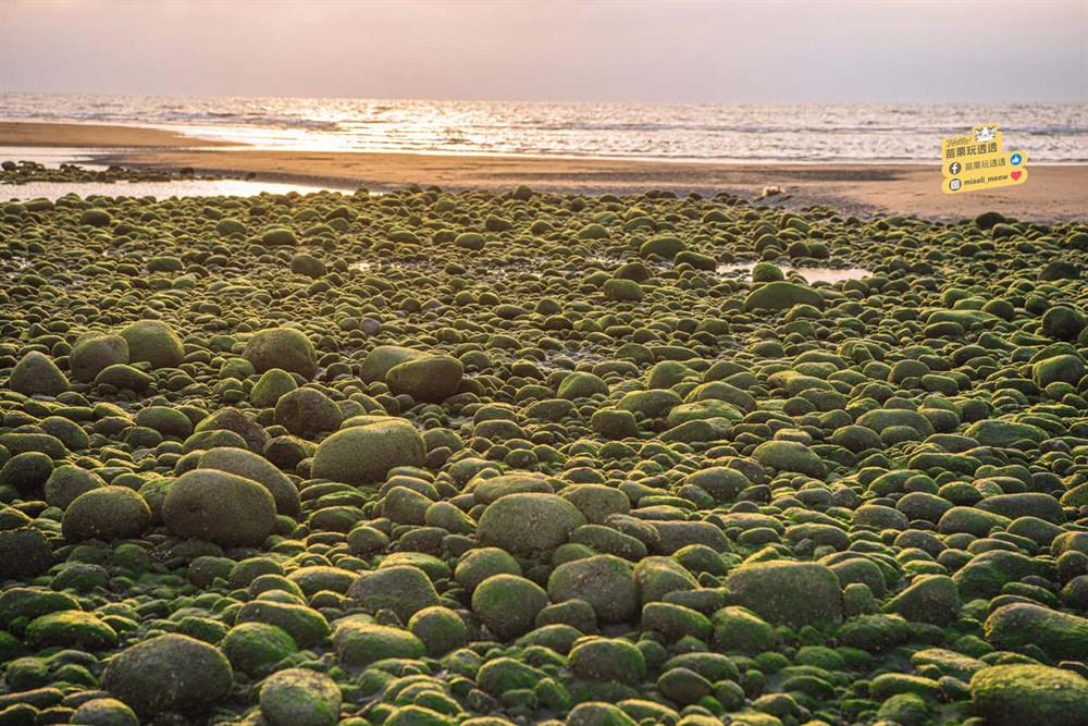 苗栗縣苑裡鎮的出水海岸,美不勝收的典型沙灘,近年來因受到天氣變化影響,每到4月至5月期間,東北季風減弱,在陽光充的足照射下,大片的「滸苔」便會覆蓋在大小不一的岩石上,形成一顆顆圓滾滾的「綠石槽」,退潮時即可看到綿延200公尺的限定特殊景觀「抹茶灣麗」,像極了飽滿紮實的抹茶麻糬,在陽光照耀下更顯得翠綠動人,極為療癒!