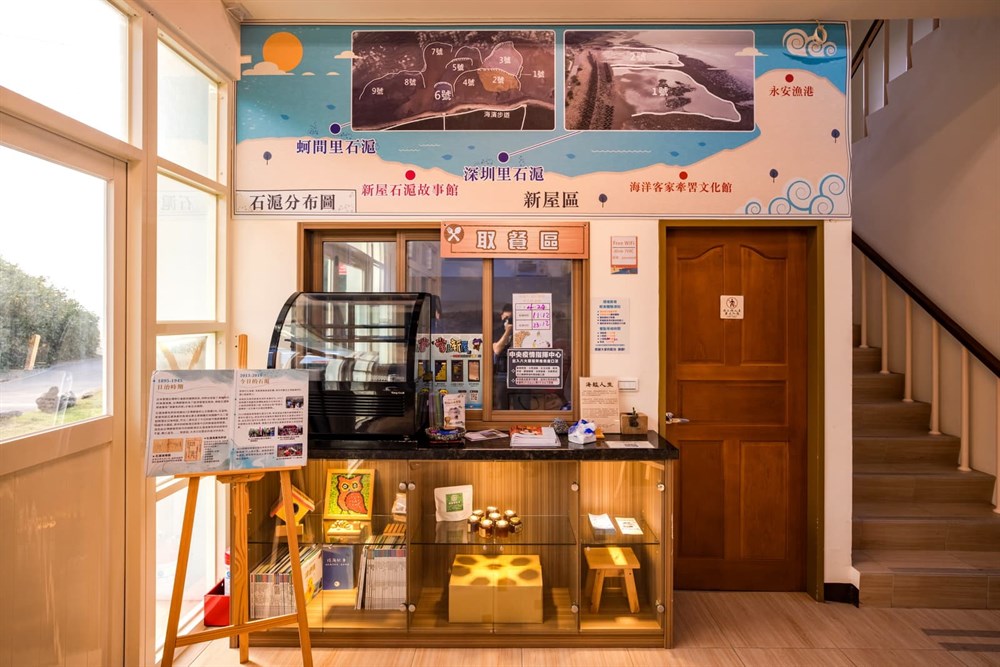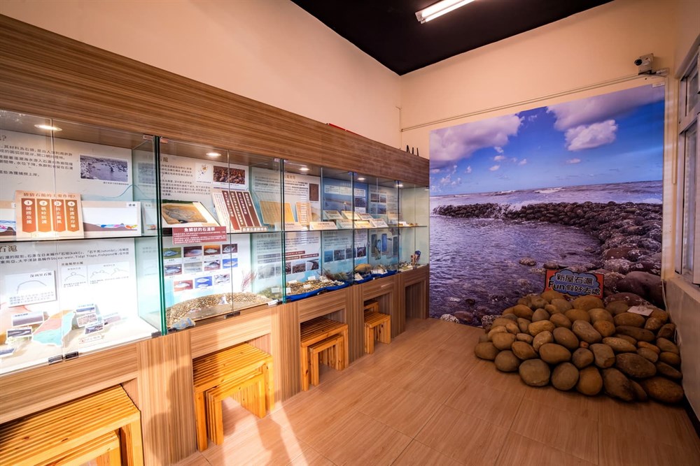 1F漁滬文化導覽區:展示石滬模型及文物紀錄著新屋石滬發展的軌跡,透過在地青年協助開發的「掌上新屋」APP,結合AR科技模擬石滬漲退潮捕魚的樂趣。
